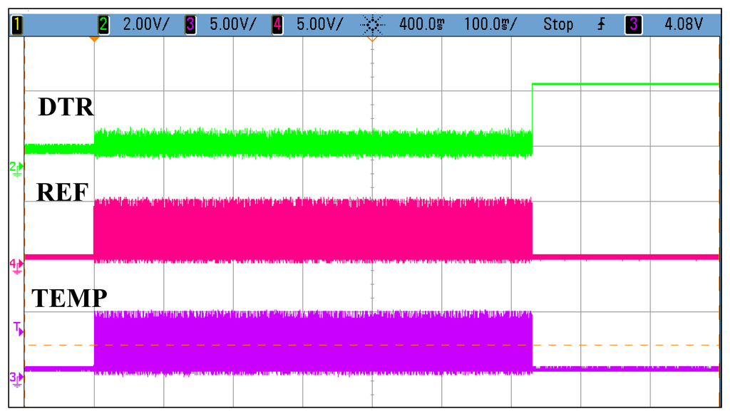 Figure 12 shows the oscillogram of the oscillator outputs in the temperature mode, where the reference oscillator correctly stops after 65,535 cycles. The DTR signal is set and is automatically reset after all of the data has been clocked out (not shown).