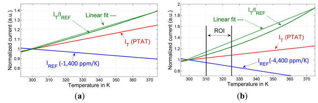 Since the temperature coefficient of the bandgap was simulated close to zero and the temperature coefficient of the n-well resistor used in BG is TCR = 3000 ppm/°C, the reference current will necessarily have a negative temperature coefficient of TCIREF = −3000 ppm/°C. Together with the chosen poly-type resistor for the PTAT current generation (−1400 ppm/°C), the sum of both coefficients is −4400 ppm/°C, which is subtracted from the 3300 ppm/°C of the PTAT current at 300 K. This presents a boost in sensitivity by a factor of 2.3 with respect to a PTAT current generator. The change in the counter value is 7700 ppm/°C · 216 ≈ 505, corresponding to an LSB resolution of 1/505 ≈ 0.002 °C. However, the increase in sensitivity is at the expense of increased non-linearity. The analysis of the latter is not trivial, and a qualitative illustration of the trade-off between linearity and sensitivity is shown instead in Figure 3. As the sensor will be used for temperature monitoring in an implant where the temperature range of interest is restricted, the errors due to non-linearity are small (Figure 3).