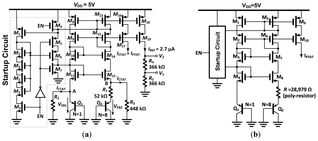 The PTAT current source is shown in Figure 5b, and its topology is similar to the bandgap reference (without the CTAT current). The poly-resistor has a negative temperature coefficient of −1400 ppm/K, in order to further increase the temperature sensitivity of the output current. The startup circuit is identical to the one used in the bandgap reference.
