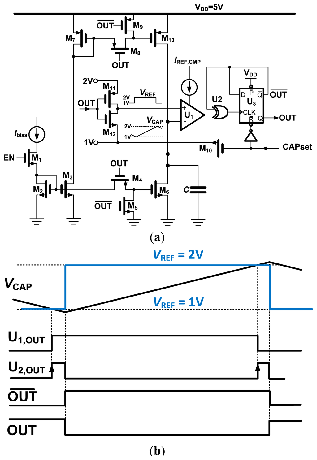 The relaxation oscillator is shown in Figure 6a. Prior to the start of the oscillation, the timing capacitor C is connected to the high impedance node formed by the inactive output transistors of the current source (M10) and sink (M6). The capacitor set (CAPset) signal resets the output and connects the output node to the lower threshold voltage. The capacitor will be rapidly charged to 1 V, allowing even the very first charging interval tON (Figure 2) to be accurately defined. The oscillator starts by driving CAPset to “0” and the oscillator enable (EN) signal to “1”, enabling the bias current through the 1:1 current mirrors formed by M2, M3, M6 and M7, M10. Output transistors M10 and M6 are alternately switched off (by M5, M9) or connected to the current mirror through M4, M8.