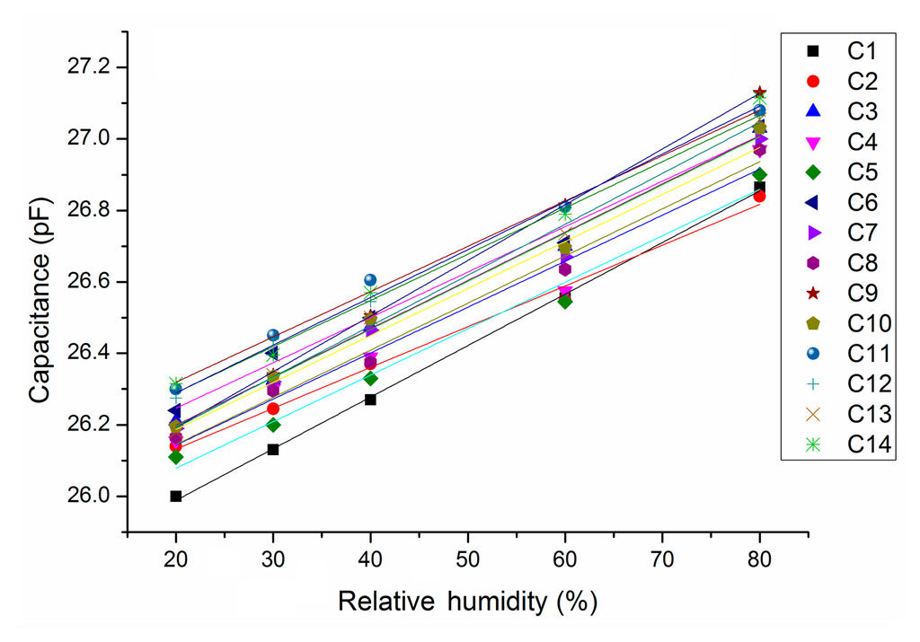 All 14 sensors of Version 1 showed a linear capacitance response as a function of humidity (Figure 8), where the coefficient of determination is greater than 0.99. The mean response is: