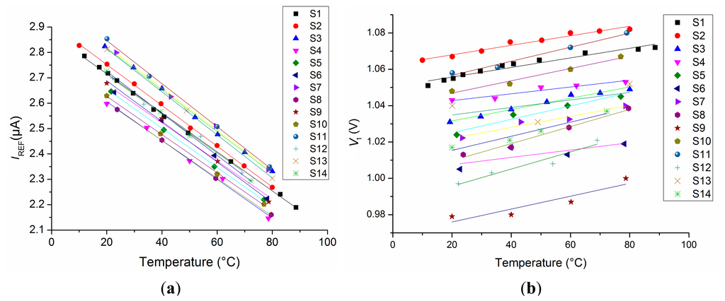 The reference current followed a linear trend with a negative temperature coefficient (Figure 9a):