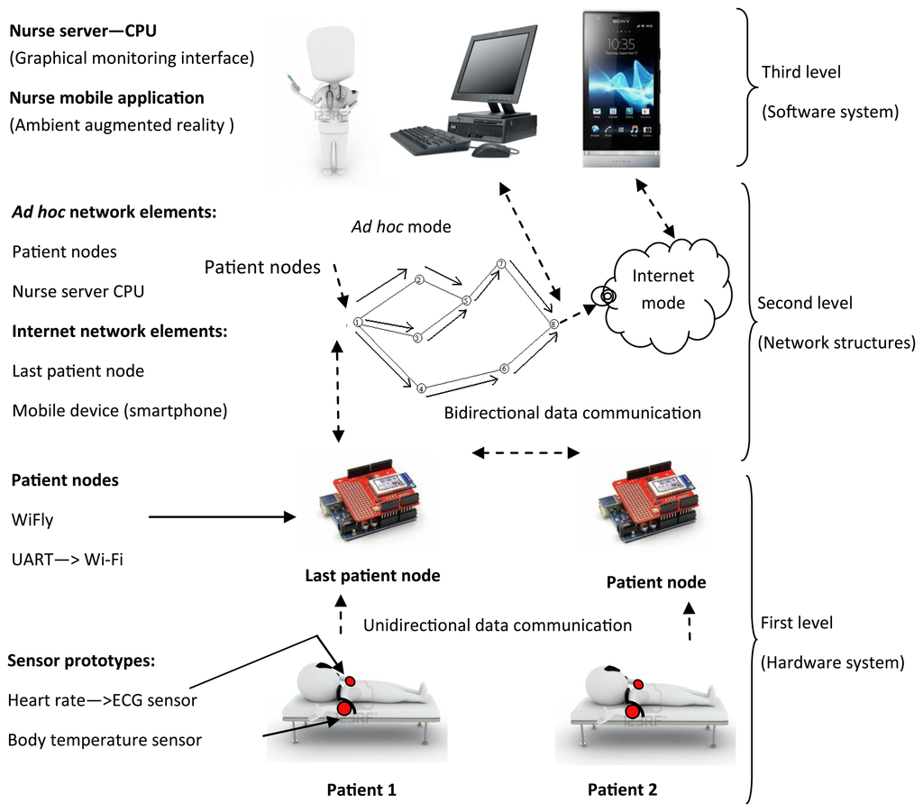 A patient node is assigned to each patient in a hospital room. Each patient node can communicate with other patient nodes in the network. The last patient node is configured to send data to the nurse server (a PC in the central nursing station) and to a smartphone (running an Android application) carried by the nurse. The specific characteristics of the hardware system, network structures, and software system are described in the following subsections.
