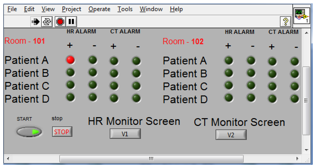 The NSI runs on a PC at the nursing station. The application displays a waveform chart of the BT and HR variables on the monitor screen. The waveform chart can be used to support the nurse's analysis of the evolution of a patient's health or the reaction of a patient who has undergone treatment. In some cases, a patient may develop an allergy or rejection related to treatment, and then it becomes necessary to stop treatment. In those cases, the NSI can identify the patient's condition to the nurse faster than can remote alarms. Figure 10 shows the main screen of the NSI; the beta version is designed for two rooms with four patients in each room. When a patient develops an anomaly, the nurse can identify in which room the event occurred, the type of anomaly, and the patient with the anomaly. Then, the nurse can select the room and the patient on the monitor screen to observe the behavior of the specific variable associated with the anomaly because this information is associated with the IP address of the patient node.