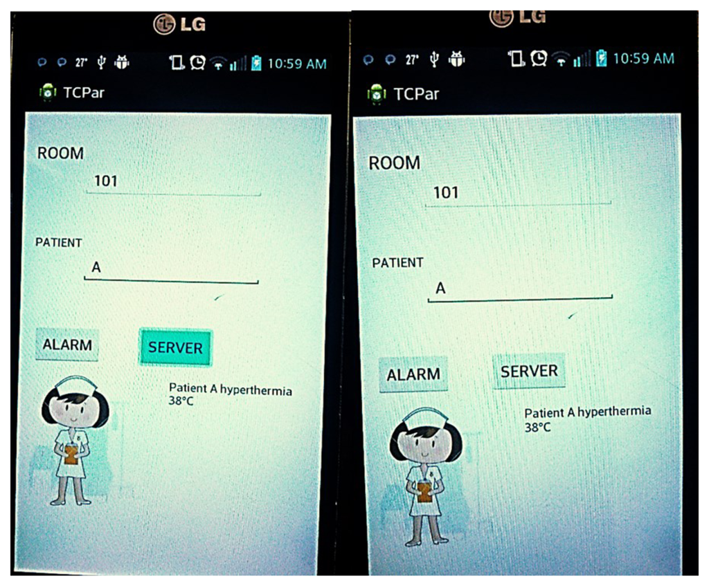 In recent years, advances in communications technology have enabled data sharing between two or more systems. Data interoperability allows the user to be informed of, and updated on, what is occurring in databases, files, or devices inside a network in specific situations [25]. The SMTRPM uses data interoperability to share information about hospitalized patients on a managed ad hoc WSN. The mobile nurse monitor (MNM) was developed in an Eclipse environment using the Android SDK (specifically, the ADT bundle for Windows) to provide continuous remote monitoring. The MNM provides the ability to test communication with individual clients via the TCP/IP protocol; however, the main objective was to create a mobile node that behaves in a server mode awaiting an alarm from the last patient node. Figure 11 shows the visual interface of the MNM application.
