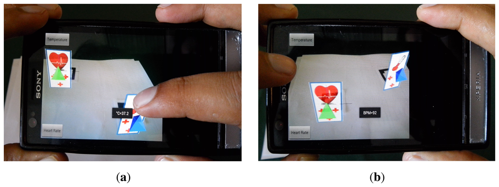 Technological innovations in the field of disease prevention and maintenance of patient health have enabled the evolution of fields such as monitoring systems. One of the main advances is the development of real-time monitors that use intelligent and wireless communication technology. In this paper, a system is presented for the remote monitoring of the body temperature and heart rate of a patient by means of a wireless sensor network (WSN) and mobile augmented reality (MAR). The combination of a WSN and MAR provides a novel alternative to remotely measure body temperature and heart rate in real time during patient care. The system is composed of (1) hardware such as Arduino microcontrollers (in the patient nodes), personal computers (for the nurse server), smartphones (for the mobile nurse monitor and the virtual patient file) and sensors (to measure body temperature and heart rate), (2) a network layer using WiFly technology, and (3) software such as LabView, Android SDK, and DroidAR. The results obtained from tests show that the system can perform effectively within a range of 20 m and requires ten minutes to stabilize the temperature sensor to detect hyperthermia, hypothermia or normal body temperature conditions. Additionally, the heart rate sensor can detect conditions of tachycardia and bradycardia.1. Introduction
