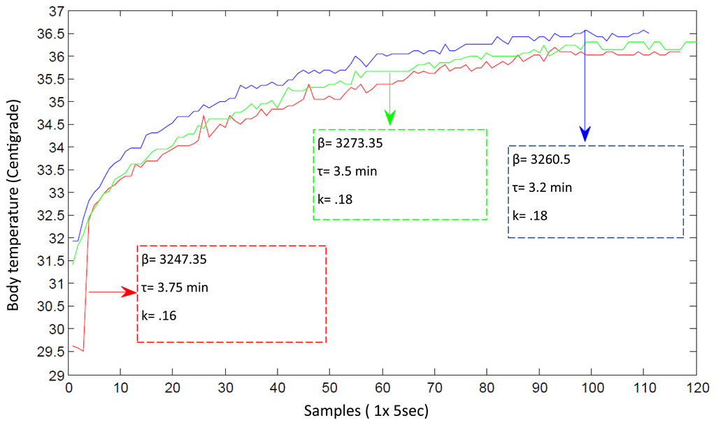 Several experiments were developed to test the main capabilities of the SMTRPM prototype. In the first level of the system, it is important to determine the response time for the acquisition of BT and HR signals. In the case of the BT response time, several measurements were performed using different values of β. Temperature behavior is often represented as a first order system in which τ is the time constant and k is the steady-state gain. The first order system is described by Equation (4).