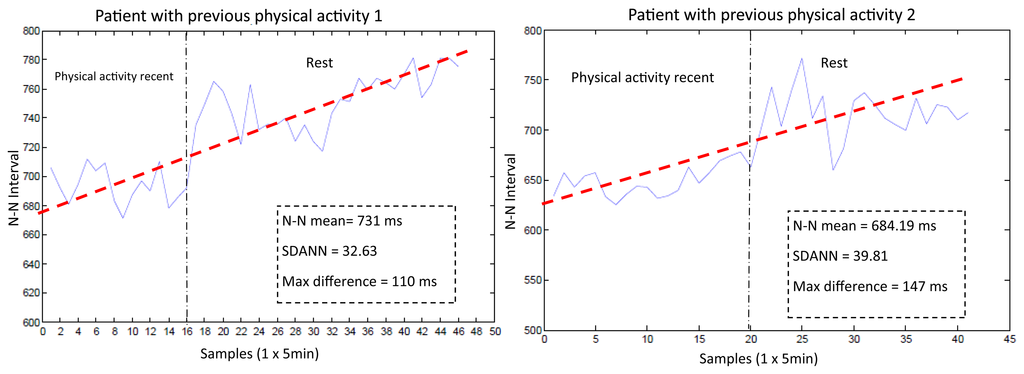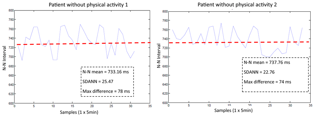 Because the HR response time depends on the BPM, it is necessary to wait at least one minute to obtain the first sample. The measurement of the standard deviation of the averaged N-N intervals (SDANN) must be allowed sufficient time, preferably 24 h [37]. To determine the SDANN and the maximum change in the N-N intervals, the SMTRPM was tested in healthy patients with and without previous physical activity. The results obtained from the HR variability test are shown in Figure 14.
