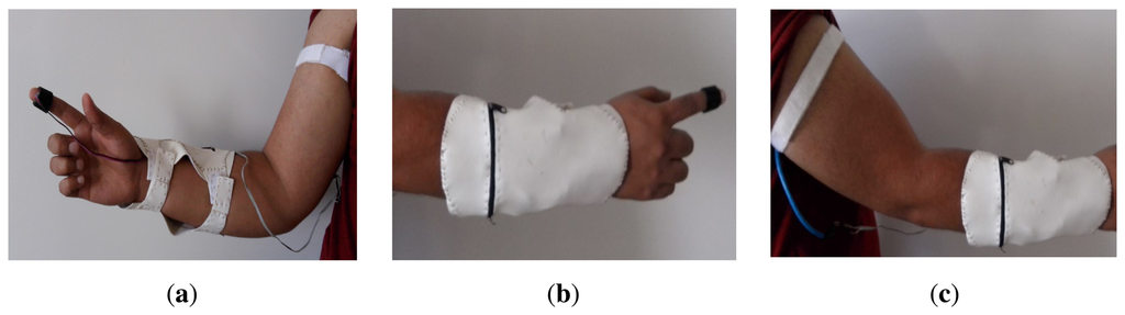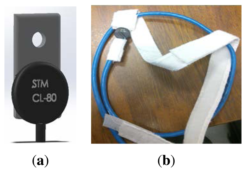 There are many places where the BT may be measured, including the armpit, mouth, rectum, and ears. In general, the armpit is the easiest location to measure the BT, and nurses place a thermometer under the patient's armpit to acquire the BT. For this reason, an elastic band was developed to locate the sensor in the armpit. The prototype for BT measurement was developed for the purpose of testing the SMTRPM; consequently, the medical security protocols that must be followed when testing medical devices in PHIs were not incorporated in the design. The final BT prototype is shown in Figure 3. The prototype is an assembly of an NTC-CL80 thermistor and an elastic band. When the device is placed on the patient, the sensor must be located in contact with the patient's armpit.