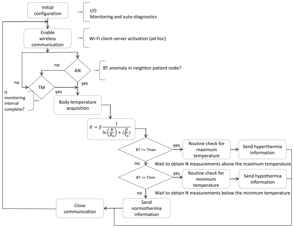Figure 5 shows the flow diagram for the BT algorithm that runs locally on each patient node. It can be observed that the monitoring process can be initiated in two ways. The first is based on the BT monitoring interval established by the nurse. The second occurs when another patient node in the network detects a BT anomaly. When a WiFi communication from another node initiates the acquisition of the BT from the patient, ten BT samples are collected to verify whether the data consistently indicate the patient's condition to be hyperthermia, hypothermia, or normothermia. Finally, the patient node sends the BT and its classification to the last patient node. The last node sends the packet of information to the nurse server and the smartphone application.