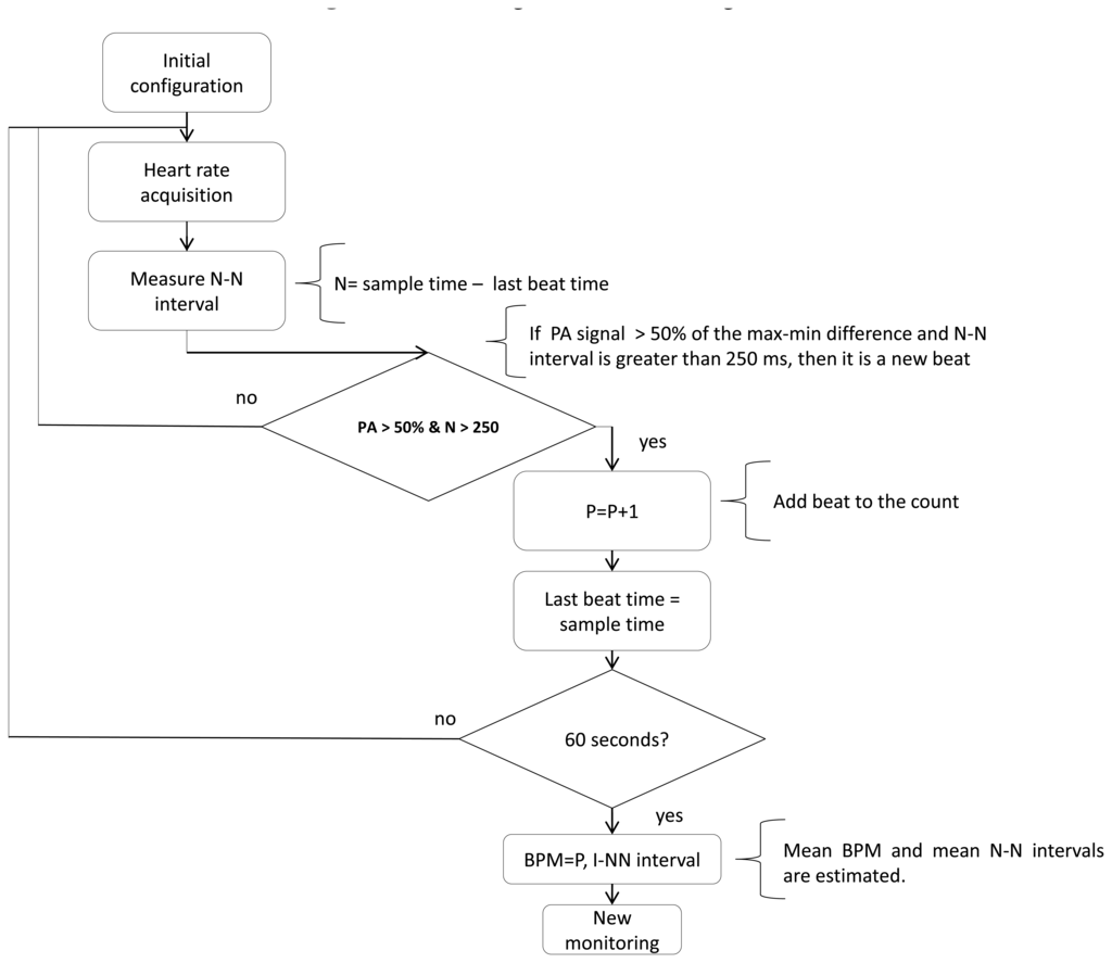 The HR smart monitoring process uses the algorithm developed by Jadav et al. [20] to determine the patient's condition. Figure 6 shows the flow diagram for the algorithm used to identify the occurrence of a heartbeat. The algorithm identifies the time at which the pulse reaches 50% of the difference between the maximum and minimum of the R wave. Data are obtained from the photoplethysmographic sensor every 2 ms using an interrupt routine. The N-N interval must be greater than 250 ms to be considered a true N-N event. When the system identifies a beat, it stores the elapsed time to establish a time reference for the next beat, and the N-N interval is estimated using the elapsed time between two beats. Every 60 s the system computes the average of the N-N intervals and the BPM. After obtaining the HR, the system identifies a tachycardic or bradycardic condition using a comparison process similar to the BT algorithm.