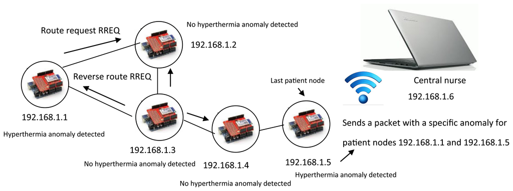 The patient nodes and the nurse server are connected via a local ad hoc remote wireless network. The dynamic nature of this type of network requires intelligence in each of the network nodes for the delivery of information packets and for routing analysis [23]. Although the patient nodes have little mobility, they must find routes to deliver information. The patient nodes must determine if a specific or general anomaly has occurred in the room by sharing individual diagnostic information with the last patient node. When a patient presents an anomaly, the node sends the information to the last patient node and sends an alarm to the neighbor. This alarm causes the neighbor patient node to begin its own monitor process, and both patient nodes send the information to the last patient node, which is the only sink that obtains information from all the patient nodes. A reactive AODV (ad hoc on-demand vector) protocol is used to determine routing and anomaly conditions. The AODV algorithm determines a destination sequence number to evaluate a destination route [24]. The SMTRPM was tested with five patient nodes per room. Figures 7 and 8 show examples of specific and general anomaly detection, respectively.
