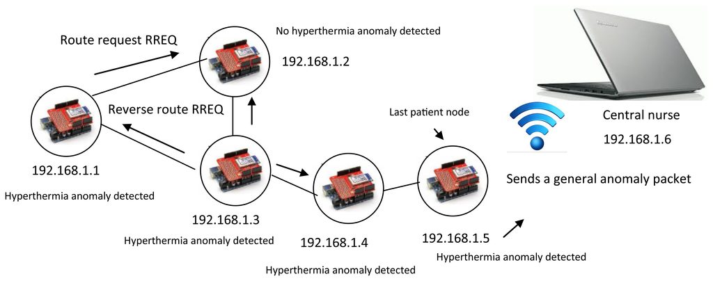 In Figure 7, only two patient nodes have detected a hyperthermia anomaly. This information is sent to the last patient node via AODV routing. In the example, the last patient node determines that a specific hyperthermia anomaly has occurred because the SMTRP is programmed to identify a general anomaly only when three or more patients present the same anomaly, as in Figure 8.