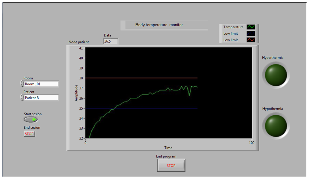 The NSI is a prototype that was created using LabView to support the analysis that the nursing staff performs to update patient health information. Typically, doctors give care instructions to the nurses when a patient has undergone treatment. For example, if a patient with an infection develops hyperthermia, the nurse dispenses medicine to reduce the patient's BT. Consequently, it is necessary to measure the BT frequently to determine the patient's rate of reaction to the treatment. Using the NSI, the nurse has the ability to remotely monitor the BT and HR at any time, reducing the time needed to monitor the patient and avoiding the need for continuous movement between rooms, especially when a nurse is in charge of many patients. Figure 9 shows the monitor screen of the NSI displaying a BT measurement.