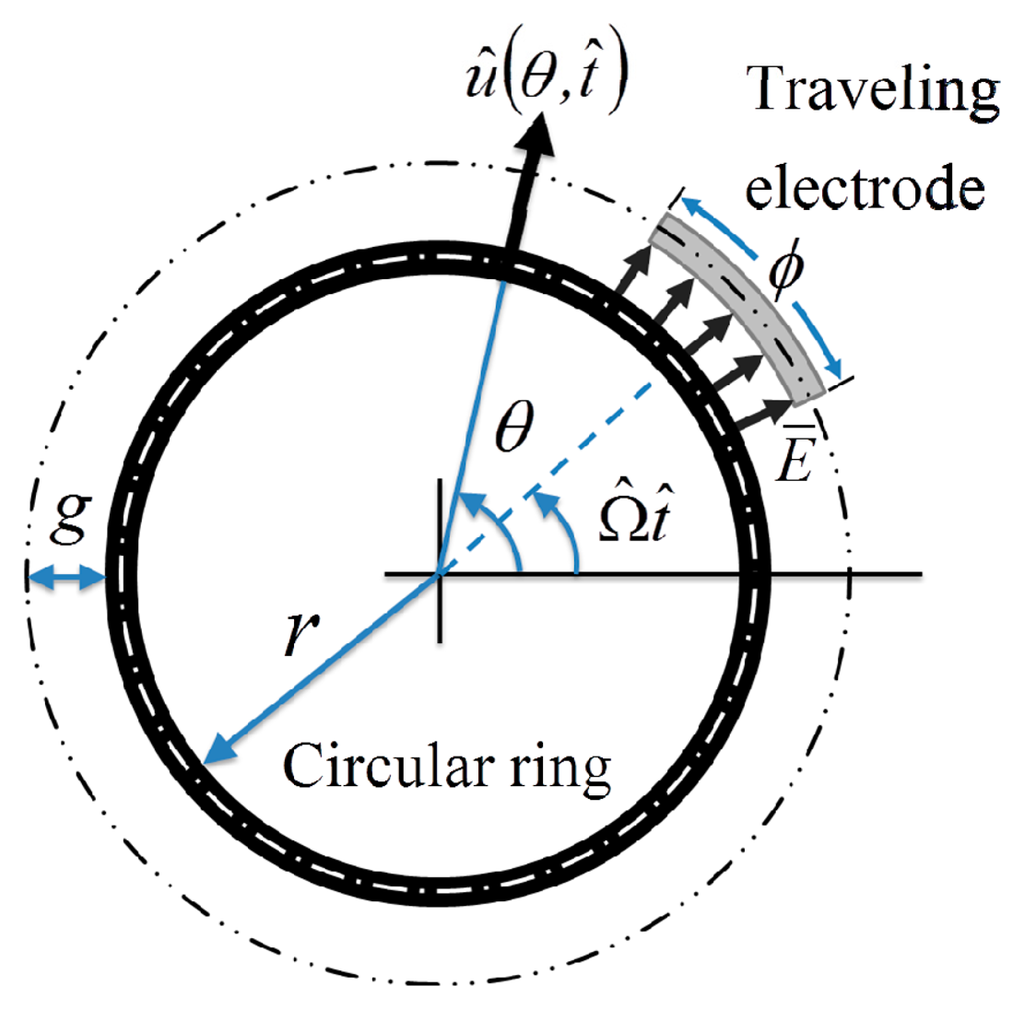 As shown in Figure 1, a uniform electrical field E̅ exists along the radial direction when there is an electrical potential difference V̂ between the circular-ring and the traveling electrode. The uniform electrical field results in a uniform distributed electrostatic force along the radial direction between the circular-ring and the traveling electrode. The uniform distributed electrostatic force traveling around the circular-ring is expressed in terms of unit step functions