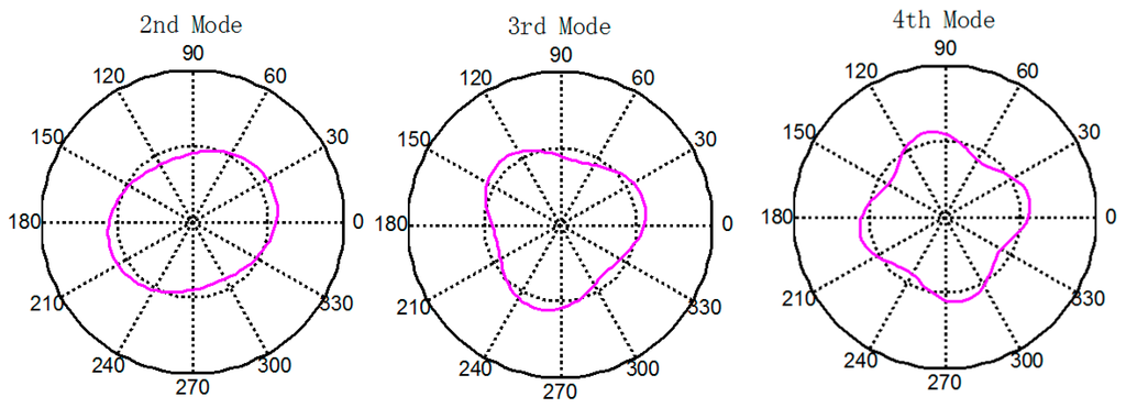 The first mode (k = 1) is omitted because it is rigid-body mode [11,13]. The numerical integration is conducted by the commercial software MATLAB. In a mathematical sense, the natural modes represent orthogonal vectors that satisfy the boundary conditions of the ring. In cases of finite-degree-of-freedom systems, the vector space is of finite dimension and the number of vectors or natural modes is equal to the number of degrees of freedom. For continuous systems, such as ring, the number of degrees of freedom is infinite. However, in practice, the lower-frequency modes dominate the characteristics of micro devices. Therefore, three terms of modal expansion is enough for most cases.