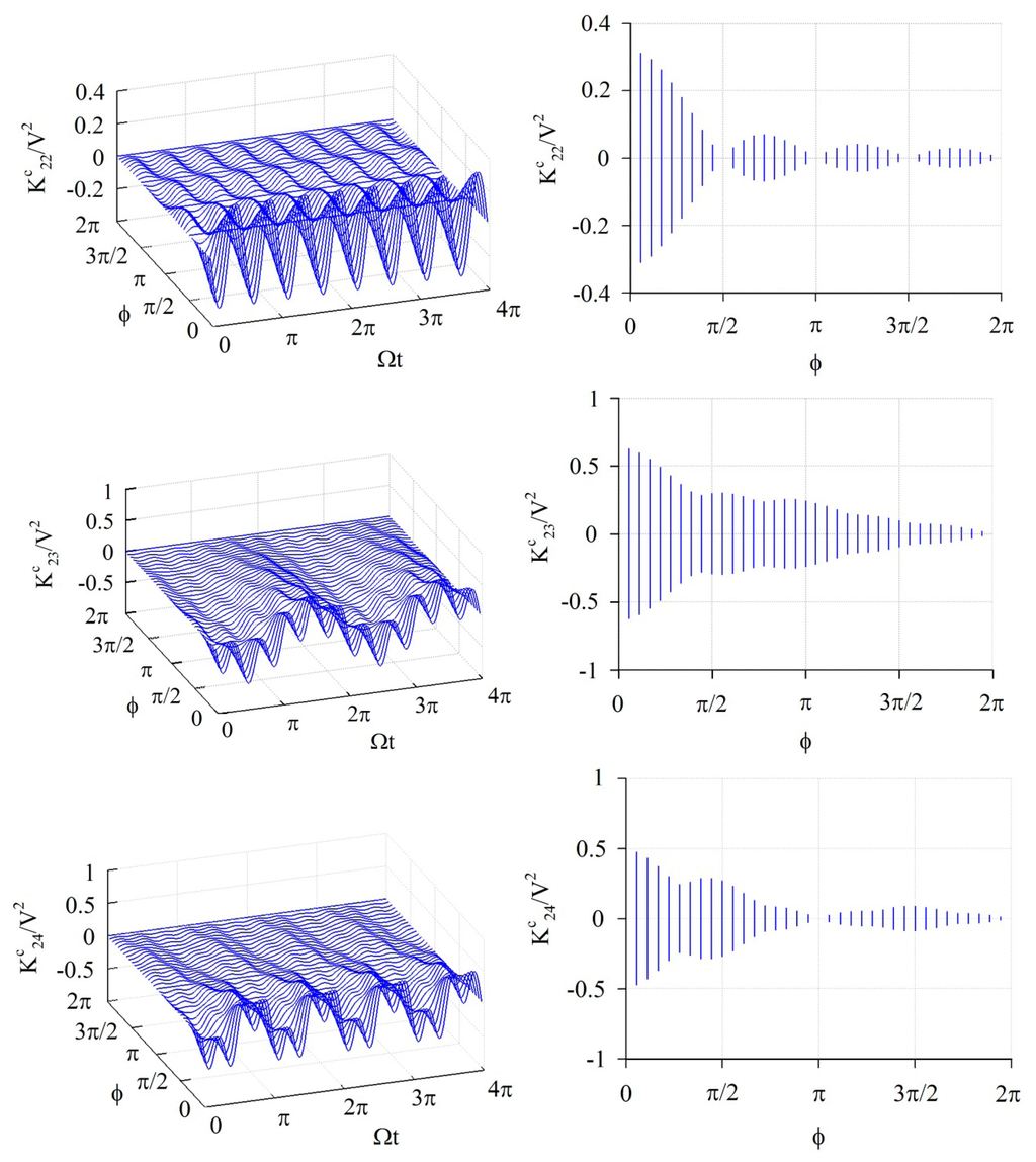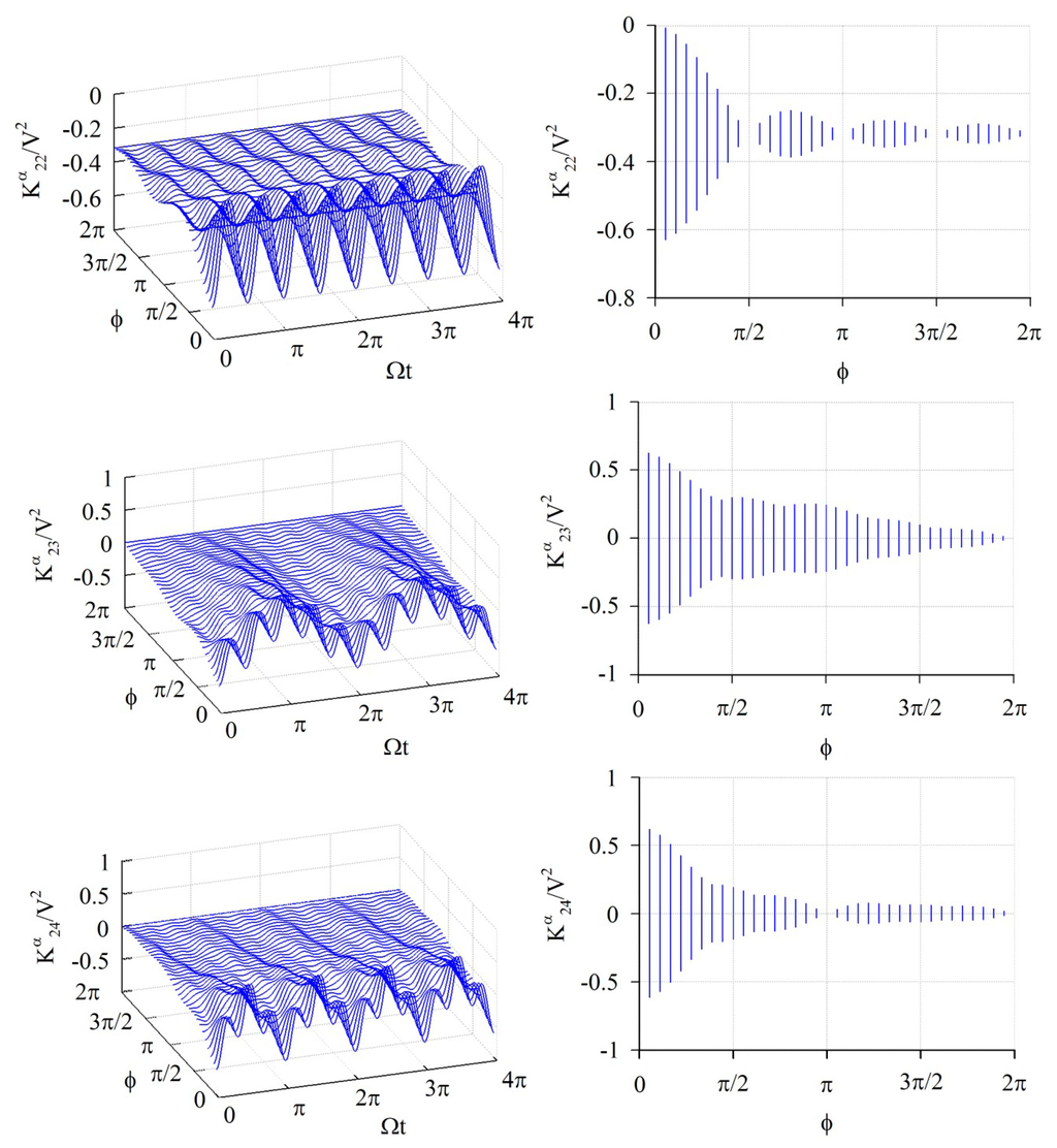 Figure 4 shows the numerical results of , , and . The value of fluctuates in a period of Ωt = π/2 and amplitude , and furthermore the amplitude is 0 as ϕ = κπ/2 ≤ 2π where κ is any positive integers, namely ϕ = π/2, π, 3π/2, 2π. The value of is composed of two periodic functions, one fluctuates in the period of Ωt = 2π/|2 − 3| = 2π and amplitude , and another one fluctuates in the period of Ωt = 2π/|2 + 3| = 2π/5 and amplitude . Furthermore, the amplitude of is 0 as ϕ = 2κπ ≤ 2π and ϕ = 2ξπ/5 ≤ 2π where κ and ξ are positive integers, namely ϕ = 2π for the present case. The value of is composed of two periodic functions, one fluctuates in the period of Ωt = 2π/|2 − 4| = π and amplitude , and another one fluctuates in the period of Ωt = 2π/|2 + 4| = π/3 and amplitude . Furthermore, the amplitude of is 0 as ϕ = κπ ≤ 2π and ϕ = ξπ/3 ≤ 2π where κ and ξ are any positive integers, namely ϕ = π, 2π for the present case.