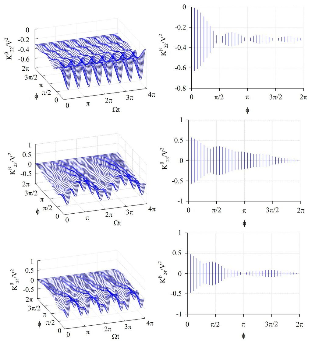 Figure 3 shows the numerical results of , , and . The value of fluctuates in the period Ωt = π/2 and amplitude , and furthermore its amplitude is 0 as ϕ = κπ/2 ≤ 2π where κ is any positive integers, namely ϕ = π/2, π, 3π/2, 2π. The value of is composed of two periodic functions, one fluctuates in the period Ωt = 2π/|2 − 3| = 2π and amplitude , and another one fluctuates in the period of Ωt = 2π/|2 + 3| = 2π/5 and amplitude . Furthermore, the amplitude of is 0 as ϕ = 2κπ ≤ 2π and ϕ = 2ξπ/5 ≤ 2π where κ and ξ are any positive integers, namely ϕ = 2π for the present case. The value of is composed of two periodic functions, one fluctuates in the period of Ωt = 2π/|2 − 4| = π and amplitude , and another one fluctuates in the period of Ωt = 2π/|2 + 4| = π/3 and amplitude . Furthermore, the amplitude of is 0 as ϕ; = κπ ≤ 2π and ϕ = ξπ/3 ≤ 2π where κ and ξ are any positive integers, namely ϕ =π, 2π for the present case.