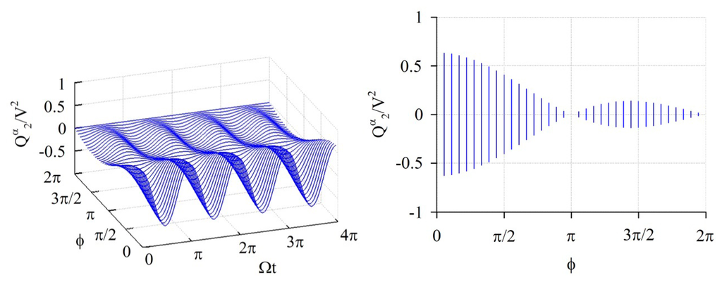 Figure 5 shows the numerical results of , , and . The value of fluctuates in a period of Ωt = π/2 and amplitude , and furthermore the amplitude is 0 as ϕ = κπ ≤ 2π where κ is any positive integer, namely ϕ = π/2, π, 3π/2, 2π. The value of is composed of two periodic functions, one fluctuates in the period of Ωt = 2π/|2 − 3| = 2π and amplitude , and another one fluctuates in the period of Ωt = 2π/(2 + 3) = 2π/5 and amplitude . Furthermore, the amplitude of is 0 as ϕ = 2κπ ≤ 2π and ϕ = 2ξπ ≤ 2π where κ and ξ are positive integers, namely ϕ = 2π for the present case. The value of is composed of two periodic functions, the one fluctuates in the period of Ωt = 2π/|2 − 4| = π and amplitude , and another one fluctuates in the period of Ωt = 2π/|2 + 4| = π/3 and amplitude . Furthermore, the amplitude of is 0 as ϕ = κπ ≤ 2π and ϕ = ξπ/3 ≤ 2π where κ and ξ are any positive integers, namely ϕ = π, 2π for the present case. Figure 6 shows the numerical results of , it fluctuates in the period of Ωt = π and amplitude , and furthermore the amplitude is 0 as ϕ = κπ ≤ 2π where κ is any positive integer, namely ϕ = π, 2π for the present case.