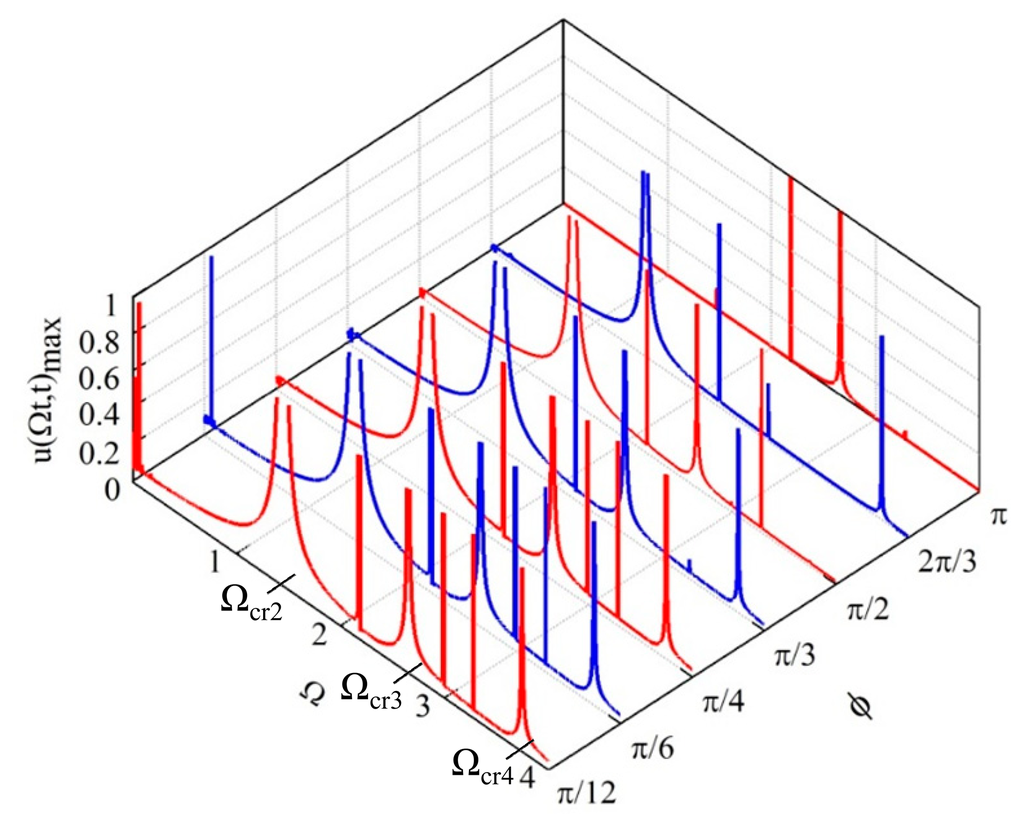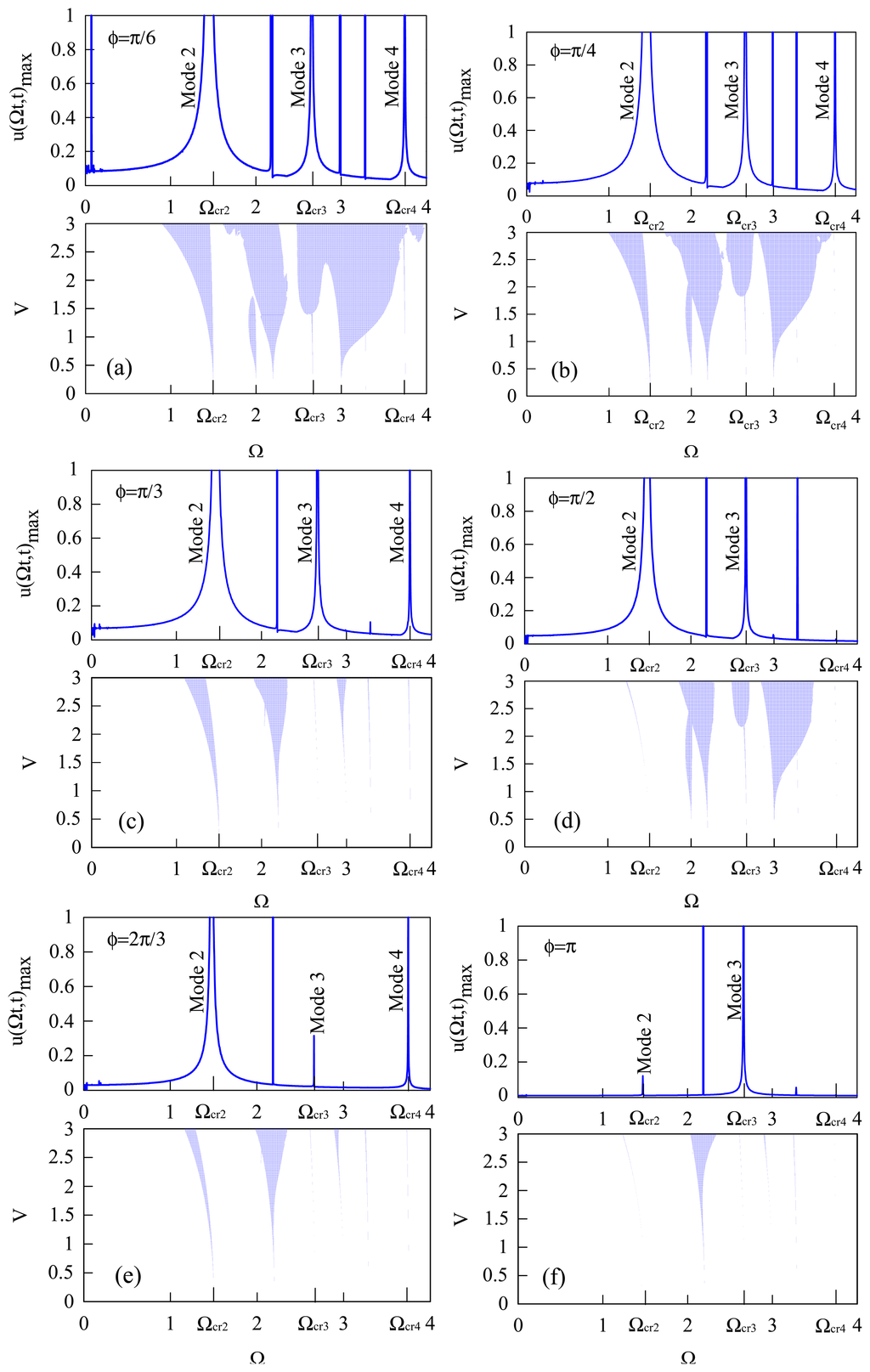Figure 7 shows the maximum response for different traveling speeds Ω and electrode span angles ϕ, in which there appears more peaks other than the intrinsic critical speeds Ωcrs. Review on the case of traveling constant force (Subsection 3.2), the forward and backward traveling waves of the circular-ring are with the same critical speed (or resonant frequency). However, for the case of traveling electrostatic force (Figure 7), there are more peaks (critical speeds) other than the intrinsic critical speeds; this phenomenon is due to the fact that the electrostatic force makes the generalized coordinates αk(t) and βk(t) coupling (view on the c-partition of the stiffness matrix in Equation (34)). The coupling of the generalized coordinates results in different critical speeds (or frequencies) for the forward and backward traveling waves of the circular-ring. Another interesting phenomenon is that the number of peaks is not the same for different electrode span-angle ϕ. This phenomenon is in agreement with the results in the Section 3.3; one can eliminate the fluctuations of some specific electrostatic stiffness by tuning the span angle of the arc electrode; especially for the case of ϕ = π, only three peaks appear at the intrinsic critical speeds (Ωcr2, Ωcr3, and Ωcr4,) because the electrostatic stiffness is eliminated.