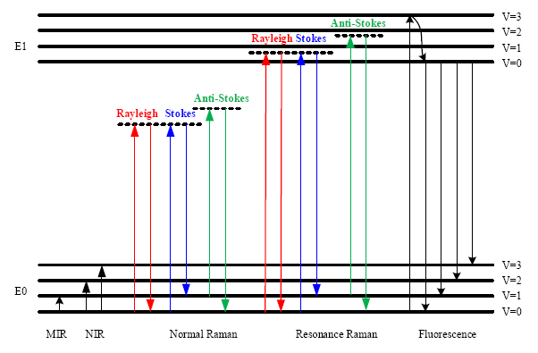 In Figure 1, the energy level diagram of IR absorption, the scattering and fluorescence processes are shown. For a normal Raman scattering process, a molecule is excited from its ground state (E0) to a virtual state when illuminated by incident radiation such as a laser. Since a virtual state is not a stationary quantized energy level and does not correspond to any eigenvalue, it will decay very fast with the emission of a photon [15]. For Stokes Raman scattering, the initial state of a molecule is the lowest vibrational state of the ground state (E0, v = 0). In contrast, the anti-Stokes Raman scattering starts from the higher vibrational energy level (E0, v = 1) of the ground state. According to the Maxwell-Boltzmann distribution law, the population of molecules at v = 0 is higher than that at v = 1, so the Stokes Raman scattering is stronger than the anti-Stokes Raman scattering under normal conditions [17]. Hence, the Stokes spectrum is mainly measured in most commercial Raman spectrometers.