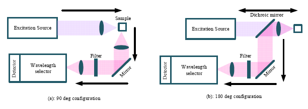 In contrast, the scattering signal is collected in the direction opposite to the excitation direction in the 180° configuration, which is also termed back scattering. Additional optics is required in the 180° configuration, such as the use of the dichroic mirror, which reflects the longer wavelength scattering signal and transmits the short wavelength excitation signal. As can be seen in Figure 2, besides the light collection system, the other three major elements in a Raman spectrometer are the excitation source, wavelength selector and detector. These major elements will be discussed in the subsections below.