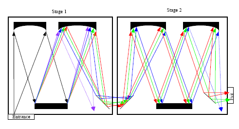 Both edge filters and notch filters have been used for Rayleigh light attenuation and rejection in a single stage monochromator. In addition, Rayleigh light rejection can also be achieved by using a multistage monochromator, which was widely used in earlier dispersive Raman spectrometers [26]. In case of double monochromators, the dispersion caused by the second monochromator can be added or subtracted from the dispersion of the first monochromator, so there are additive and subtractive double monochromators. Figure 3 shows the simplified diagram of an additive double monochromator.