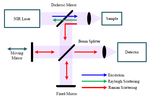 Figure 4 shows a block diagram of a FT-Raman spectrometer based on a Michelson interferometer. The excitation source from a NIR laser is directed to the sample through an optical mirror and lens, which also collects the scattered signals (Rayleigh and Raman) from the sample. The dichroic mirror transmits the short wavelength Rayleigh scattering signal and reflects the longer wavelength Raman scattering signal to a beam splitter. Through the beam splitter, half of the Raman signal is transmitted to a fixed mirror and half is reflected to a moving mirror. Because of the optical path difference caused by the moving mirror, the two beams reflected from the two mirrors undergo constructive and destructive interference, determined by the travel range of the moving mirror. Finally, the signal with all frequencies is registered on the detector simultaneously and the interferogram can be obtained from the detector.