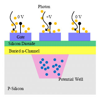 The CCDs consist of a large matrix of pixel elements, the fundamental structure of which is a metal-oxide-semiconductor diode on a thin silicon substrate [44,45]. A polysilicon gate is deposited on top of each pixel, and an external bias is applied to the gate to control the potential of the region beneath the gate. By applying different biases (reverse bias and zero), an individual pixel is isolated from the neighboring pixels because of the insulating barriers (potential well shown in Figure 5). For pixels that are reverse-biased, depletion regions are formed, and charges are held and stored within the potential well up to the full well when illumination is applied. In contrast, those zero-biased pixels are transparent to the incoming photons. The number of charges generated is proportional to the intensity of the incident light flux, and the full well capacity determines the maximum light intensity that can be detected. By adjusting the bias, carriers stored in the potential well can be transferred to the output of the detector.