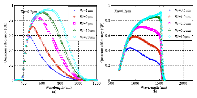 The silicon-based avalanche photodiode (APD) is a PN junction working in the reverse-biased mode [50,51]. When incident photons are absorbed, electron-hole pairs are generated in the depletion region and multiplied through the avalanche multiplication process. APDs are highly sensitive detectors with internal gain, although their gain is lower than PMTs. Similar to CCDs, the lower QE of the photodiodes at longer wavelengths is determined by the band gap of silicon. Increasing the width of the depletion region or using a different material with a narrow band gap can improve the detection efficiency in longer wavelength. Figure 6 simulates the dependence of QE on the width of the depletion region and its distance from the surface of the detector for both silicon and germanium.