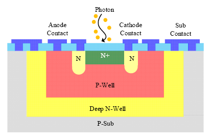 A silicon-based APD is robust, inexpensive, and easy to miniaturize. It can be operated at a lower voltage supply and is compatible with CMOS control circuitry. Although the CCD is the mainstream detector in commercial Raman instruments, APD is also a promising technology for portable and high-speed detection systems. In past decades, tremendous progress has been achieved for APDs through improvements in gain, size of active region, and response time. Commercial APDs are available from a variety of companies, for example, Hamamatsu Corporation, Boston Electronics and OSI Optoelectronics. In academia, a low noise APD with 7.6 nA/mm2 dark current density, fabricated by CMOS 0.35 μm technology, was reported in 2008 [52]. Another APD with a gain of 569 and 3.2 GHz 3 dB bandwidth under 10.6 V reverse bias was described in 2010 [53]. This APD was the highest gain bandwidth product among the CMOS technology fabricated APDs.