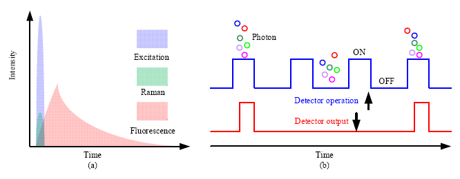 In time-gated Raman spectroscopy, the detection should be synchronized with the excitation source, and only signal overlapping with the excitation source in time domain can be detected, which is known as time-gated detection. Two techniques have been used for time-gated measurement, one of which is to modulate or time-gate the incoming optical signal, such as the introduction of the optical shutter; the other is to modulate the detector by gating the detector only in a predetermined short time window, and to turn off the detector after the time window. Figure 8b shows the time-gated operation of a detector, from which we can see that only photons arriving within the gate window can be detected.