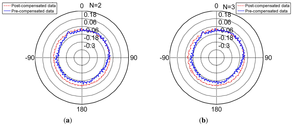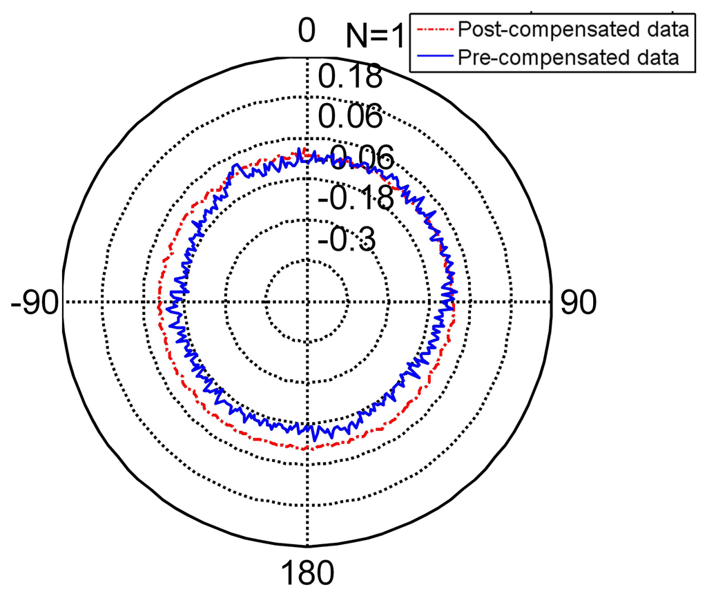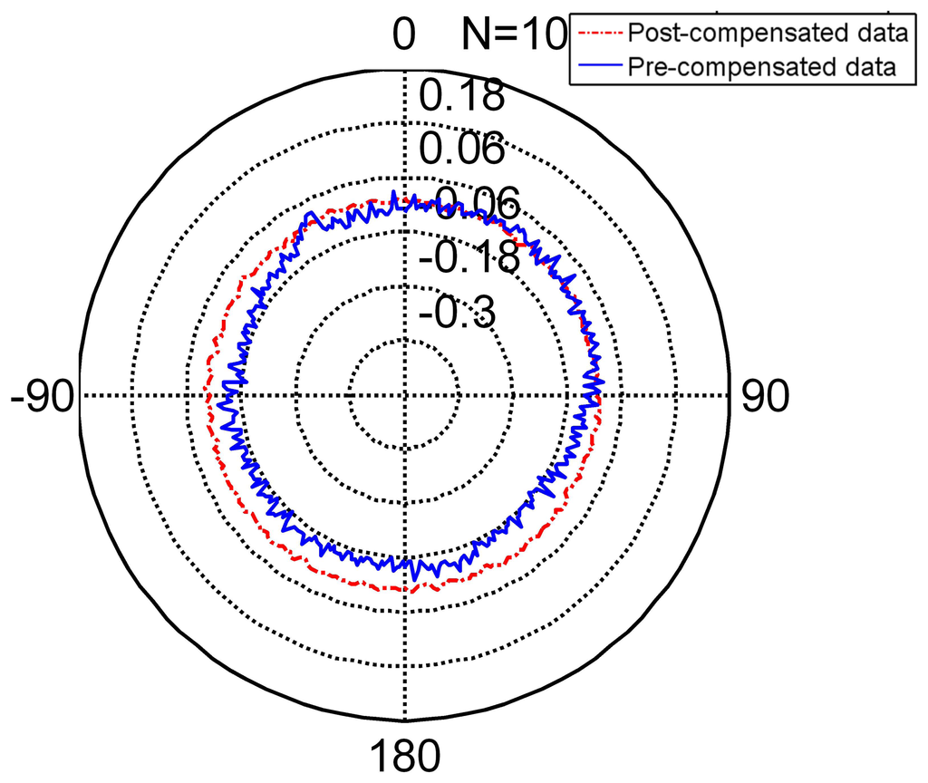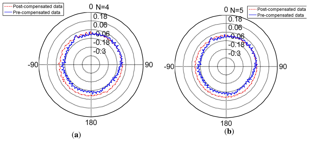 The radar Figure 8 shows the compensated data and Table 5 shows the feature of compensated data. Compared to the features in Table 6, its standard deviation reduces from (pre-compensation) to (post-compensation). It is under its resolution and achieves its nominal precision. The error range of the encoder narrows obviously. Thus, the encoder compensated for by the FNN is slightly more precise than its nominal precision.