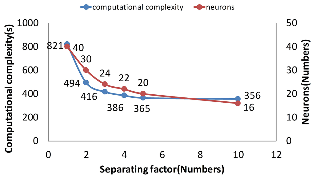As is mentioned in Section 3, the core of separating is that computational complexity is reduced by the trend after the separating. When the separating factor N is 10, the computational complexity is the lowest (Figure 12). While the separating factor N is one, the memory cost is the highest in the figure. Therefore, if N divided is employed in the training process, the training time is reduced by time.