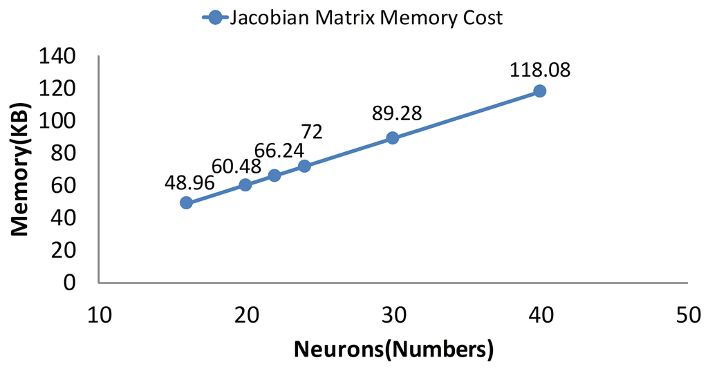 With the aim of training the FNN, the LM algorithm is applied. However, as the data amount increases, the computational complexity and memory cost increase rapidly. It is not possible for the computer to calculate and store too large of a Jacobian matrix, since the computational complexity of computing the inverse of a n × n matrix is O(n3) and the memory cost is O(n2) [23]. Therefore, the LM algorithm is limited by the data amount. However, we can partition the data into small subparts and then employ the LM algorithm to solve the problem.