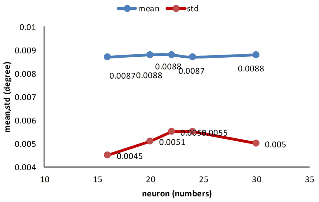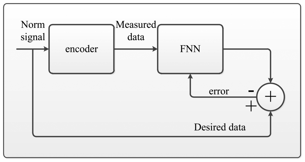 Once the training is processed, the adapted parameters of the FNN are loaded into the NN, until it reaches the stop condition. The FNN is evaluated by presenting both of the testing sets and the training set patterns. Then, it calculates the output after compensating. In the specification of the rotary encoder, the system precision is always presented by the standard deviation of the errors.