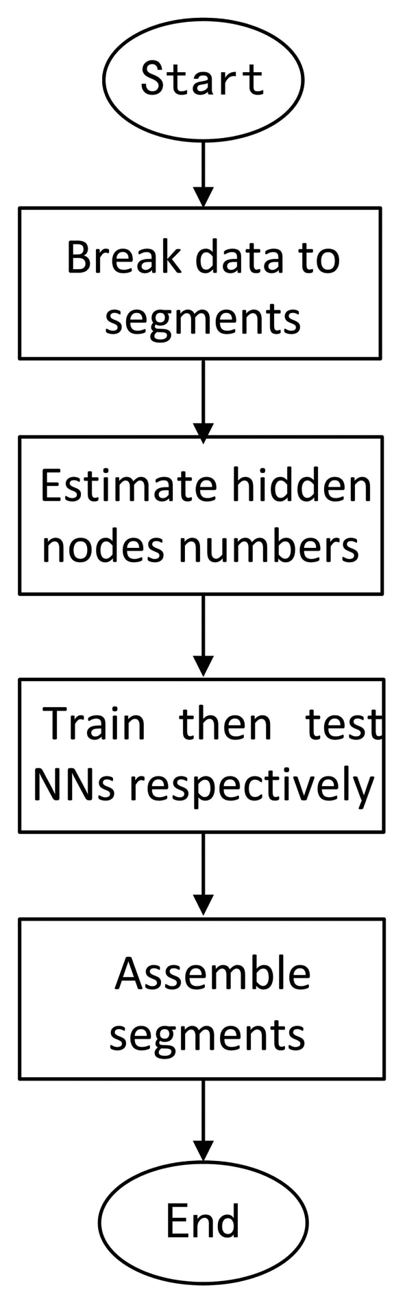 The decomposition algorithm we propose partitions single NN to small-scale NNs and searches the necessary numbers of hidden nodes. We partition the data to N parts and search for the optimal partitioning factor N, for the purpose of reducing the computational complexity and memory most effectively. After being partitioned to N segments, the data are compensated at the same precision level by N smaller NN. The same order of magnitude precision of different partitioning methods is guaranteed by the finite accuracy theory. This theory is presented by Wray et al. in [11]. They present that the NN can be considered as constructing a polynomial approximation when the NN is implemented on a computer with finite accuracy bounds. Hidden node numbers are adjusted by the trial and error method traditionally. However, when the data amount grows, its computational complexity and memory cost grow in order O(n3) and O(n2), respectively. It is invalid to apply the trial and error method to adjust hidden node numbers. We review serial explorations of the relationship between the data and the hidden node number, searching for opportunities to lower the computational complexity and memory orders of the data. Huang et al. in [12] present a conservative method in the estimation of hidden node numbers for non-sigmoid NN. They rigorously prove that standard single hidden layer feedforward networks with at most M hidden neurons and with any bounded nonlinear activation function, which have a limit at one infinity, can learn M distinct samples with zero error. Tamura et al. in [13] give a proof showing that a three-layered feedforward network with M — 1 hidden units can approximate any M input-target relations exactly. Barron et al. make further progress in [14]. When the data amount is M, the bounds on the numbers of hidden nodes can be effectively obtained by order .