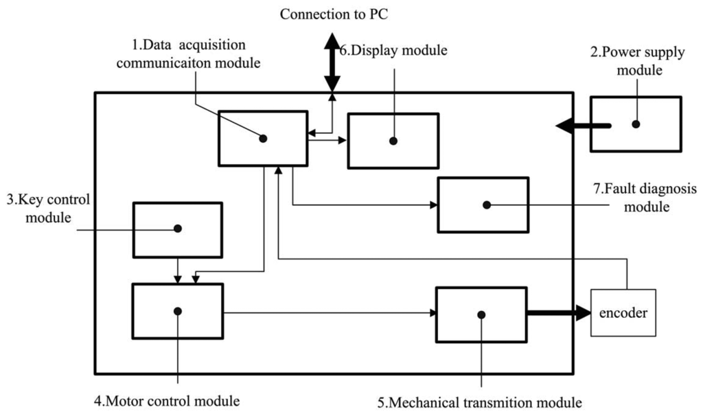 The data acquisition communication module is a micro control unit (MCU). It acquires and transmits the signals of the encoder, connecting the test device and human computer interface.
