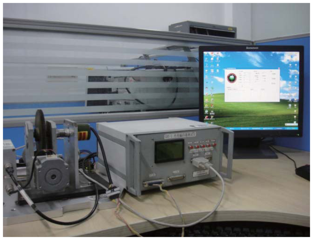 The PC is illustrated in Figure 6. It serves as the human-computer interaction, receives data transmitted from the test device and compensates for the data of the encoder by an intelligent algorithm. During the test, the encoder is spurred by the test device. With the purpose of subjecting the encoder under test to the whole range of angles, the test device spins from zero degrees to 360 degree. Thus, it obtains encoder measurement for each angle, which is processed by a data acquisition module that is acting as an interface between the test device and PC. The data of the encoder are acquired by a 16-bit parallel port with a speed up to 2 M/s. The obtained data are sent to a PC through RS232 serial communication. Then, the data are stored and shown by the human-computer interaction module. The human-computer interaction module also controls the measure-acquisition-process system.