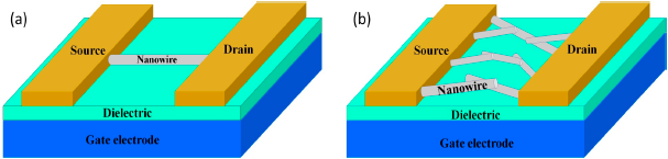 Gas sensors based on nanowire FETs usually have the structures depicted in Figure 1. Note that MOSFET sensors work on the principle that molecules entering into the sensor area will be charged positively or negatively, which have a direct effect on the electric field. Introducing each additional charged particle will affect directly the transistor in a unique way, producing a change in the MOSFET signal that can then be interpreted by pattern recognition. Therefore, unlike the top-gate MOSFET gas sensors [47,48], nanowire FET gas sensors usually use an bottom-gate structure. With such a structure, the channel is accessible by the target molecules to serve as the sensing components. Usually, individual nanowires or nanowire network films work as the sensing elements. The fabrication process of these devices includes the synthesis of nanowires and the construction of FET devices.