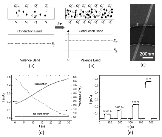 Several other oxide nanowires have also been reported [91–93]. A special work is mentioned here. As has been discussed, the main purpose of the gate potential is to tune the free carrier density in the nanowire, which is balanced with the captured carriers on the surface. Light illumination can also increase the free carrier concentration in an oxide nanowire and is used to realize optically driven oxygen sensing in low conductance nanowires [93]. The key to fast response is to rapidly tune the carrier density. In a semiconductor, the carrier density can be modulated by above-bandgap light. Under illumination, the oxide nanowire that initially has a high conductance, such as ZnO nanowires, needs a long time to reach equilibrium [86]. Based on such facts, by using low conductance nanowires, an optically driven fast oxygen sensing mechanism was proposed and demonstrated [93]. As shown in Figure 10a, initially, the free carrier density in a nanowire is low; the modulation of its conductance by oxygen will be very small. Under illumination, the current across the nanowire will increase to a value that can reflect the level of the oxygen pressure very quick, as shown in Figure 10b.