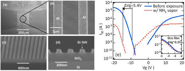 Based on silicon-on-insulator (SOI) wafers and nanoimprint lithography, a top-down approach was used by Talin et al. to fabricate Si nanowire FET gas sensors [96]. Large-area, dense p-type nanowire array sensors are shown by the SEM images in Figure 11a–d. The Si nanowires are well defined with diameters of about 76 nm and oxidized with O2 plasma treatment. The nanowire channel exhibited similar mobility to the corresponding thin film device, indicating no significant degradation of the Si nanowire body during the dry etching process. The response (defined as the shift of threshold voltage) of the Si nanowire FET sensors to NH3 vapor is shown in Figure 11e. Due to the reducing character of NH3, a negative shift of the threshold voltage by about 5.4 V was observed. In contrast, a thin film device shows a much smaller threshold voltage shift, as shown in the inset of Figure 11e. This top-down approach could be very promising in the investigation of Si nanowire FET gas sensors.