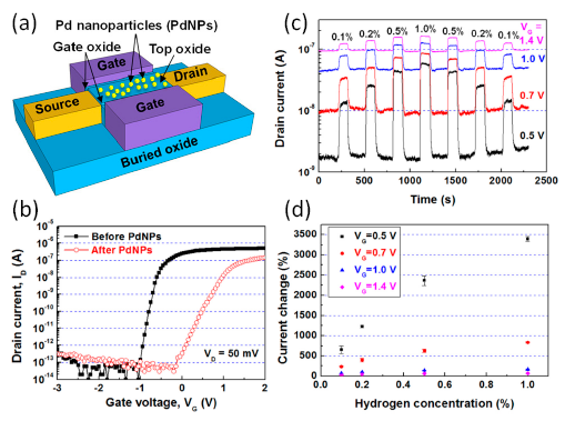 Using the fabrication processes similar to the FinFET [97], an n-type Si nanowire FET with two side-gates was fabricated by Park et al. [98] as shown in Figure 12. The nanowires' sensing/top surface was oxidized by annealing and passivated with H bonds. The device has a channel width of 100 nm and a gate length of 1 μm. The side-gates were insulated from the nanowire channel by thermally grown SiO2 of about 5 nm thick. To enhance the H2 selectivity and sensitivity, the nanowire top surface was further deposited with a ∼1 nm thin Pd layer. During the operation, two side gates were applied with the same voltage.