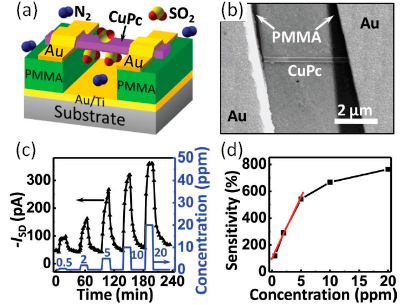In the inorganic nanowires shown above, the modulation of the free carrier concentration by the surface chemical process is the main mechanism for gas sensing. It is different when an organic nanowire is used as the channel, because in organic semiconductor hopping transport dominates. Several works are about organic nanowire FET gas sensors [99–105]. A typical work is discussed here. By using single crystalline CuPc nanowires, room temperature SO2 sensing with low detection level down to sub ppm regions was reported by Liu et al. [99]. In their system, the CuPc nanowire was floated from the substrate, thus the whole channel was exposed to the gas atmosphere, as shown by the illustration in Figure 13a and the SEM image in Figure 13b.