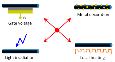 Firstly, we comment on the basic tuning mechanisms that have been used. In the nanowire FET gas sensors, the chemical process at the nanowire surface can affect the transfer characteristics. Therefore, by appropriately choosing the gate voltage, the carrier concentration in the nanowire can be tuned and the sensing performance can be improved. In addition to the gate voltage, other methods can also be used as extra controls over the nanowire channel for gas selectivity and sensitivity, response time etc. Figure 14 summarizes four methods that are used and discussed in the above section. In addition to the gate voltage, metal nanoparticle decoration, light irradiation and local heating are also efficient tuning methods. Metal decoration and local heating can increase the surface activity of the nanowire, while above-bandgap irradiation can result in a sharp increase of the carrier concentration and a reset of the surface condition.