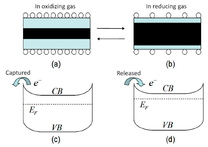 In the case of metal oxides, the adjustment of the carrier concentration by gas molecules is the main mechanism for gas sensing. Figure 2 shows an example of an n-type oxide nanowire in oxidizing and reducing gases. In an oxidizing gas environment, some of the free electrons in the conduction band are captured on the surface and the free carrier concentration decreases. In contrast, in a reducing gas environment, due to the reaction on the surface, some of the captured electrons are released into the conduction band as free carriers. Therefore, the conductance of oxide nanowires can be tuned by the surface chemical process. In a FET gas sensor, this process can be further tuned by the gate voltage.