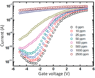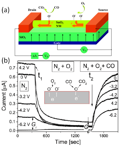 The response of the device to three different gas atmospheres was investigated. As shown in Figure 3b, when the gas only contains N2, oxygen desorbs thermally from the surface of the nanowire, creating surface vacancies. The electrons captured by the oxygen adsorption are thermally excited into the conduction band and the current is high. When oxygen is introduced into the gas flow at t1, the SnO2 nanowire surface adsorbs it at the vacancy sites, and the electrons, that are localized in the vacancy and able to be easily activated into the conduction band, are trapped again. They can no longer contribute to conductance and thus the current decreases. At time t2, CO is introduced into the gas mixture, which reacts with oxygen ions on the surface and creates oxygen vacancies as new donor states. The current across the nanowire channel increases again. It can be seen that the gas response curves can be tuned by the gate voltage, especially at the decaying and rising regions. By changing the number of electrons available for oxygen surface chemistry, the oxidation rate and the extent of oxygen adsorption can be modulated. When the gate voltage is carefully selected, the sensitivity of the device can be extremely high. Their results showed that manipulating the carrier concentration inside a nanowire affects the chemical reactivity of its surface and are very important for nanowire FET gas sensors.