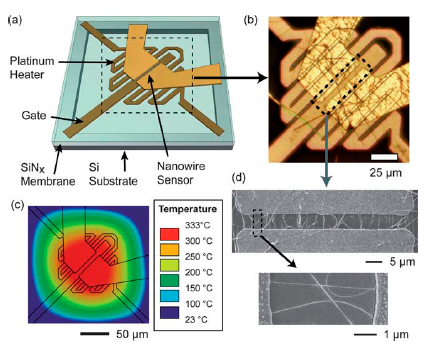 In addition to gas sensitivity, gas selectivity is another important parameter in gas sensors. Since for a semiconductor channel, various reducing (or oxidizing) gases affect the current across the nanowire channel with the same trend, more controls over the channel are therefore required to realize selectivity. As an interesting example, Dattoli et al. combined temperature and gate voltage control to modulate SnO2 nanowires [72]. As shown schematically in Figure 5, the device contains a local-heating apparatus which can heat the nanowire to desired temperatures. Together with the gate voltage, the SnO2 nanowire sensor can be set to different working conditions to realize selectivity. During the test, the temperature and gating conditions were modulated in order to induce variations to the sensor's response behavior to analyte. By treating the results as identifying fingerprint, analyte identification is achieved using a statistical pattern recognition procedure, linear discriminant analysis. Obviously, this interesting method can be applied to other nanowire systems and are very promising.