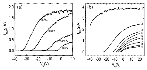 Using individual ZnO nanowires, Wang et al. fabricated FET sensors and investigated the oxygen sensing properties under ultraviolet illumination [86]. As shown in Figure 6a, the channel current is sensitive to the oxygen pressure. The response of the FET sensors to oxygen is characterized by a shift of threshold voltages as well as a change of channel current. The current decreased and the threshold voltage was shifted to the positive direction with increasing oxygen pressure. In addition, with increasing oxygen pressure, the slope in the linear region decreases. This can be ascribed to increased oxygen ion coverage at the nanowire surface at higher oxygen pressure. They also found out that, in addition to gate voltage, ultraviolet light illumination strongly affects the transfer characteristics, as shown in Figure 6b. Upon illumination, the current at an oxygen pressure of 105 Pa increases a lot, as shown by curve 1 in Figure 6b, due to photo-generated carriers as well as light-induced desorption of surface oxygen ions. Curve 2 is measured 1 min after turning of the ultraviolet light. It takes nearly half an hour for the device to recover. The results indicate that above bandgap illumination can severely affect the oxide nanowire channel which can be further used as an additional control method of nanowire FET gas sensors.