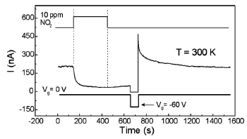 The quick refresh of the nanowire channel, especially the nanowire surface, is very important for the application. It is difficult to return nanowire chemical sensors to the initial state at low temperature because the thermal energy is normally lower than the activation energy for desorption. However, Lu et al. found out that in addition to significantly affecting the gas sensitivity, the gate potential can also be used as an effective method to refresh the nanowire sensors [87], as shown in Figure 7. The pulses of 10 ppm NO2 gas and the gate potential are shown by the top and bottom curves, respectively. On exposure to NO2 pulse the current across the nanowire decreases gradually. After turning off the NO2 gas, the current is still at the low level and increases very slowly. By applying a Minus60 V gate potential, the current increases sharply and then drops gradually to the initial conductance state. The refresh process is markedly accelerated by a large negative gate potential. The interesting result in this work expands our understanding on the gate potential.